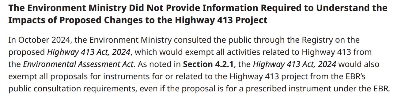 Despite this, when the Ford government sought public feedback on exempting the project from the EBR via Bill 212, the Reducing Gridlock, Saving You Time Act, 2024 and the Highway 413 Act, the Auditor General found that “The Environment Ministry did not describe these impacts in the proposal notice and did not provide any information about whether these impacts would be assessed through the new process, or how significant impacts would be mitigated.”
