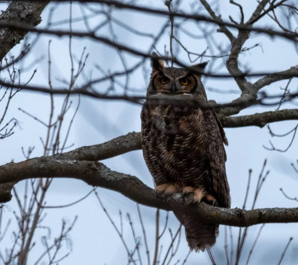 To my surprise, roughly 20 minutes after entering the forest, I noticed a new shape among the branches of some trees. At first, I thought, “There is no way it's an owl,” but as I moved to get a better look through the various branches in the undergrowth, there it was—a Great-Horned Owl sitting among the branches, seemingly unaware of my presence.