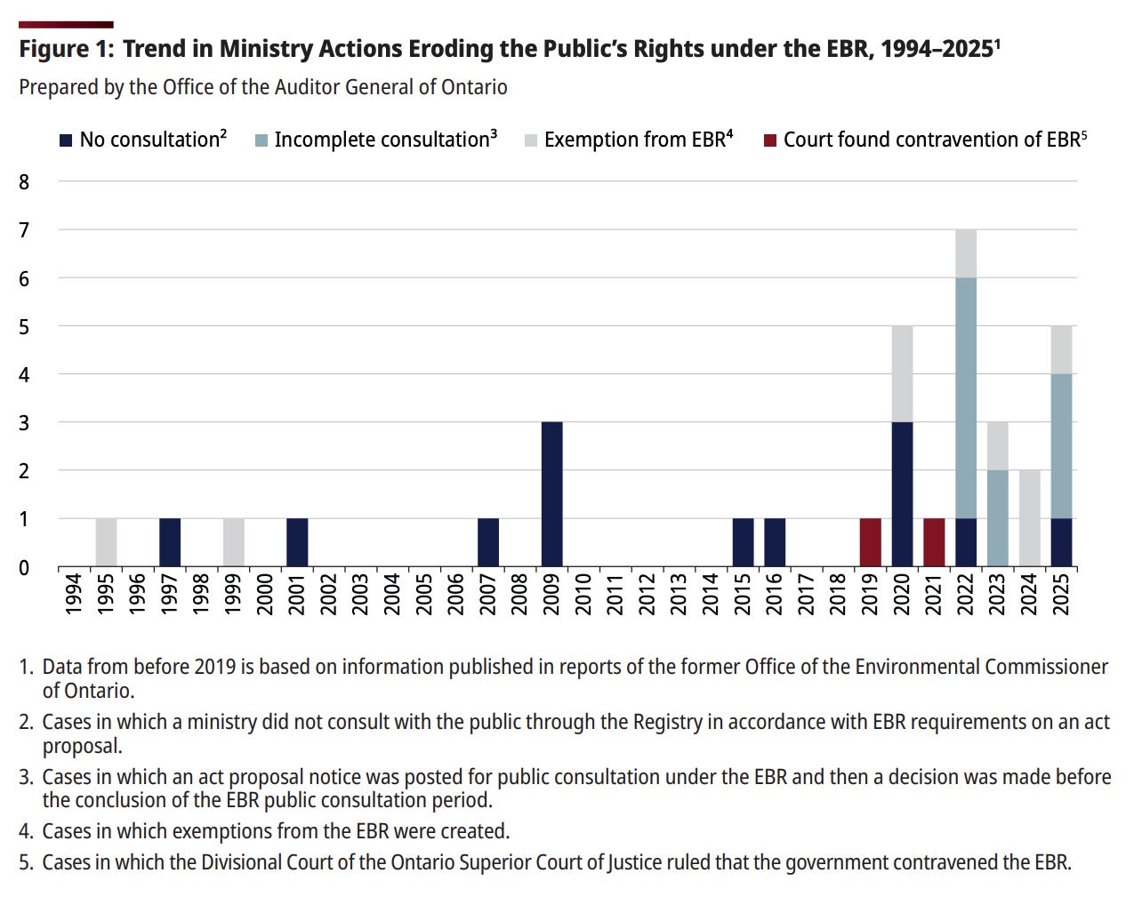“In particular, since 2019, the Province has been taking actions that had rarely or never been taken since the EBR was enacted in 1994 (see Figure 1),” reads a line in the report.