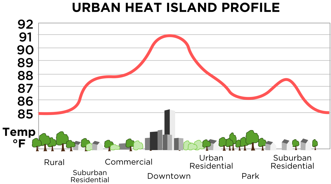 This means that areas dense with urban infrastructure and lacking trees will heat up faster than the surrounding areas.